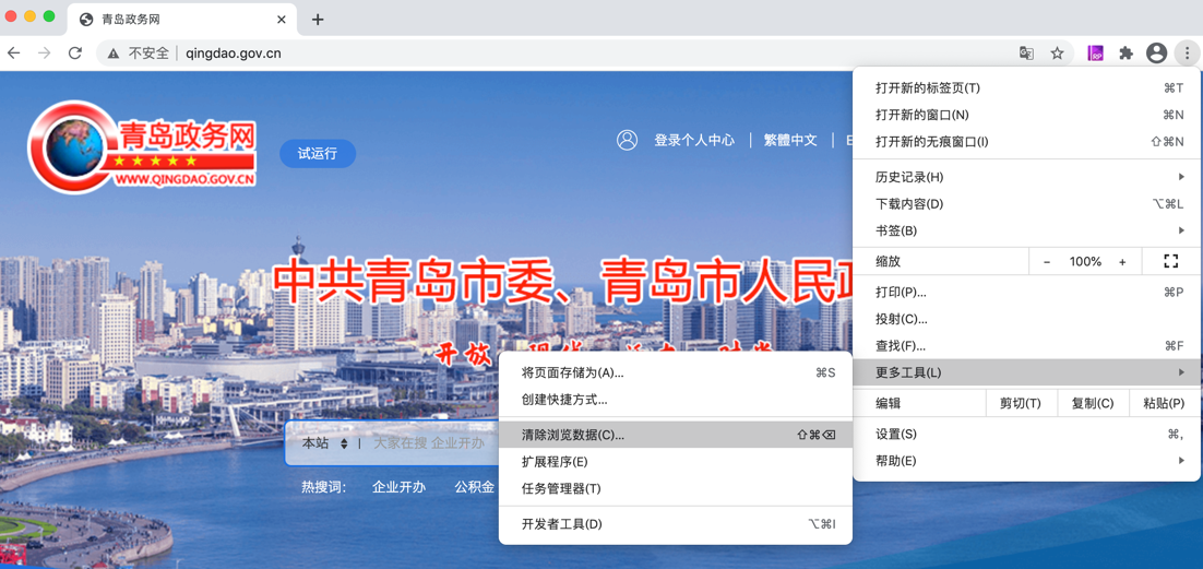 點擊谷歌瀏覽器的更多工具->清除瀏覽數(shù)據(jù)選項,