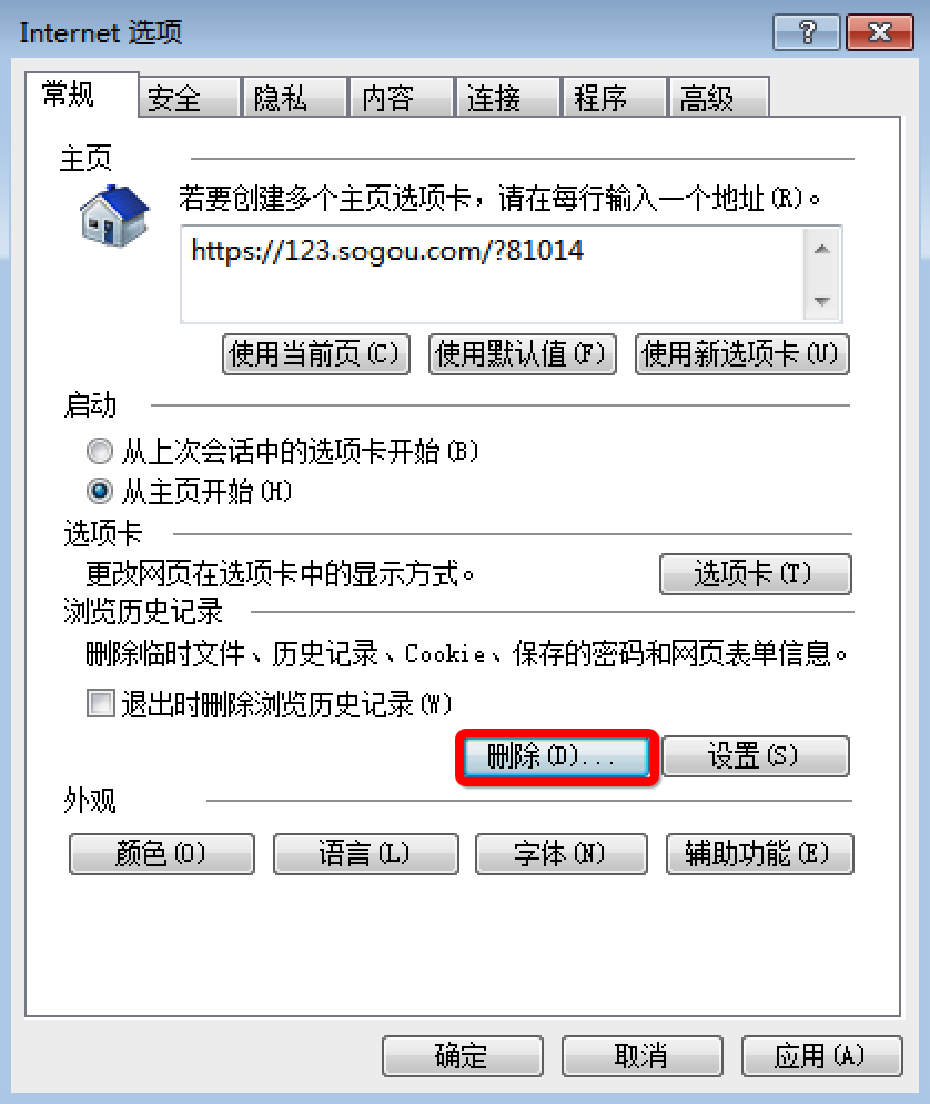 點擊IE瀏覽器的Internet選項,在彈出的選項卡中,點擊刪除按鈕。