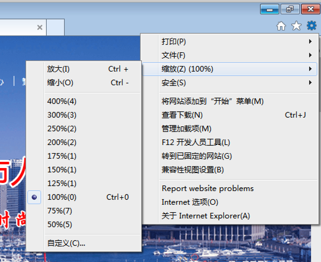 瀏覽器縮放設(shè)置,以IE瀏覽器為例進行說明:點擊瀏覽器“工具”菜單->縮放,推薦使用100%。