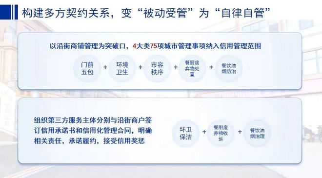 同時(shí),構(gòu)建多方契約關(guān)系,變“被動(dòng)受管”為“自律自管”。以沿街商鋪管理為突破口,在“門前五包”的基礎(chǔ)上,將環(huán)境衛(wèi)生、市容秩序、餐廚廢棄物處置、餐飲油煙防治等4大類75項(xiàng)城市管理事項(xiàng)納入信用管理范圍,并組織環(huán)衛(wèi)保潔、餐廚廢棄物收運(yùn)、餐飲油煙治理等第三方服務(wù)主體分別與沿街商戶簽訂信用承諾書和信用化管理合同,明確相關(guān)責(zé)任,承諾履約,接受信用獎(jiǎng)懲。截至2022年11月,市區(qū)229條重點(diǎn)道路20201戶沿街商鋪組織簽訂信用承諾書20201份和信用化管理合同6.2萬(wàn)份,實(shí)現(xiàn)沿街商戶100%全覆蓋。