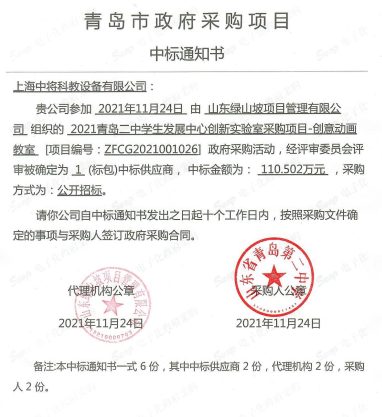 青島二中創(chuàng)意動畫教室中標(biāo)通知書