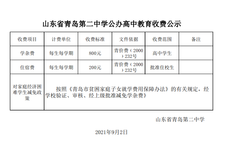 2021年青島二中教育收費(fèi)公示