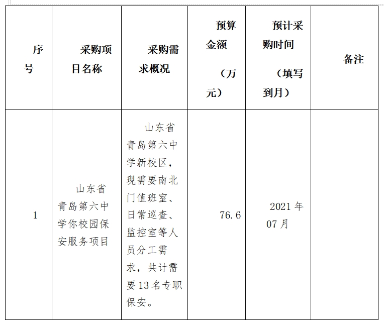 為便于供應(yīng)商及時了解政府采購信息,根據(jù)《財政部關(guān)于開展政府采購意向公開工作的通知》(財庫〔2020〕10號)等有關(guān)規(guī)定,現(xiàn)將 山東省青島第六中學(xué) 2021年 06(至)08 月采購意向公開如下: