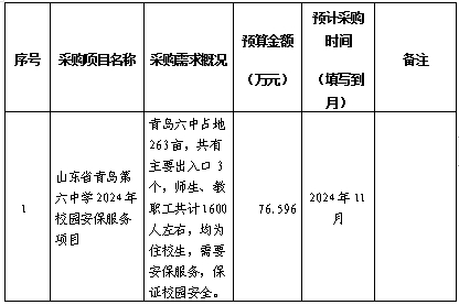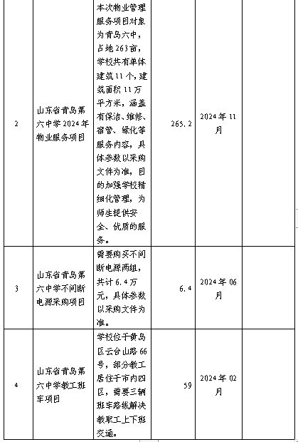 為便于供應(yīng)商及時了解政府采購信息,根據(jù)《財政部關(guān)于開展政府采購意向公開工作的通知》(財庫〔2020〕10號)等有關(guān)規(guī)定,現(xiàn)將 山東省青島第六中學(xué) 2024年 01(至)12 月采購意向公開如下: