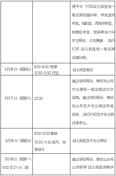 自主招生測(cè)試分為文化課統(tǒng)一筆試測(cè)試與美術(shù)專業(yè)測(cè)試???生持自主招生統(tǒng)一筆試測(cè)試通知單,按照通知單上的考點(diǎn)和時(shí)間?參加筆試測(cè)試,文化課統(tǒng)一筆試測(cè)試地點(diǎn):四區(qū)、高新區(qū)考生筆?試測(cè)試的考點(diǎn)、考場(chǎng)由市教育局統(tǒng)一編排;西海岸新區(qū)、城陽(yáng)區(qū)、?即墨區(qū)考生筆試測(cè)試在青島六中。參加文化課統(tǒng)一筆試測(cè)試的所?有考生均應(yīng)參加我校自招美術(shù)專業(yè)測(cè)試,美術(shù)專業(yè)測(cè)試在青島六?中進(jìn)行??忌殧y帶身份證、自主招生統(tǒng)一筆試測(cè)試通知單參加?美術(shù)專業(yè)測(cè)試。美術(shù)專業(yè)測(cè)試有關(guān)要求,考生于?5?月 15 日(星?期?四?)晚登錄學(xué)校網(wǎng)站查詢。