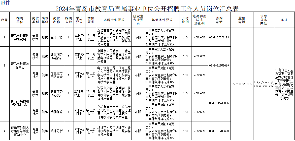 根據(jù)事業(yè)單位公開招聘有關(guān)規(guī)定,結(jié)合青島市教育局直屬事業(yè)單位崗位空缺情況和工作需要,2024年青島市教育局部分直屬事業(yè)單位面向社會(huì)公開招聘初級(jí)專業(yè)技術(shù)崗位工作人員6名(詳見附件《2024年青島市教育局直屬事業(yè)單位公開招聘工作人員崗位匯總表》,以下簡(jiǎn)稱《崗位匯總表》)?,F(xiàn)將有關(guān)事項(xiàng)公告如下: