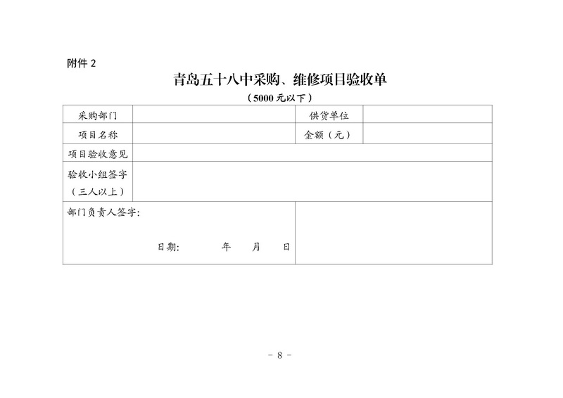 2.《青島五十八中采購項目驗收單》(附件2)。