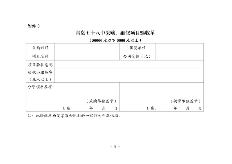 5.《青島五十八中采購項目驗收單》(附件3)。