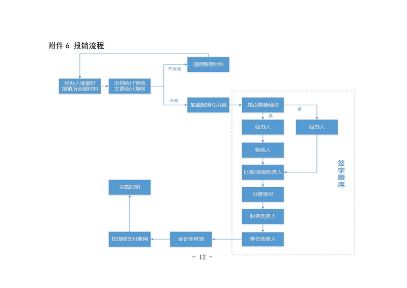 1.報銷需嚴(yán)格落實出納會計預(yù)審、主管會計復(fù)審報銷程序,報銷人對取得的各類經(jīng)費(fèi)開支報銷單據(jù)分類匯總,交由出納初審、主管會計復(fù)核無誤后并加蓋報銷專用章,按照經(jīng)辦人(處室/級部)、處室(級部)主任初審簽字,分管領(lǐng)導(dǎo)審核簽字,財務(wù)負(fù)責(zé)人簽字,單位負(fù)責(zé)人審批簽字后進(jìn)行報銷。