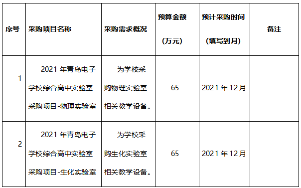 為便于供應(yīng)商及時了解政府采購信息,根據(jù)《財政部關(guān)于開展政府采購意向公開工作的通知》(財庫〔2020〕10號)等有關(guān)規(guī)定,現(xiàn)將 青島電子學(xué)校 2021年 11(至)12 月采購意向公開如下: