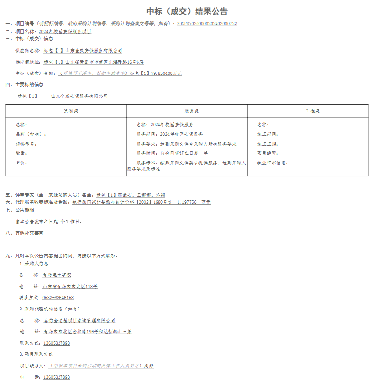 青島電子學(xué)校2024年 校園安保服務(wù)項目成交公告