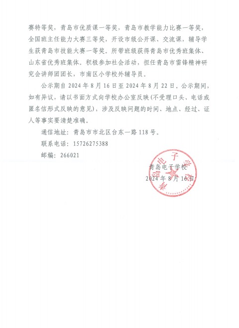 青島電子學(xué)校2024年教育系統(tǒng)先進(jìn)個(gè)人擬推薦申報(bào)人選公示