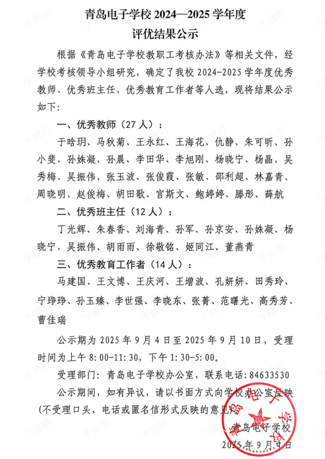 青島電子學(xué)校 2024-2025學(xué)年度評優(yōu)結(jié)果公示