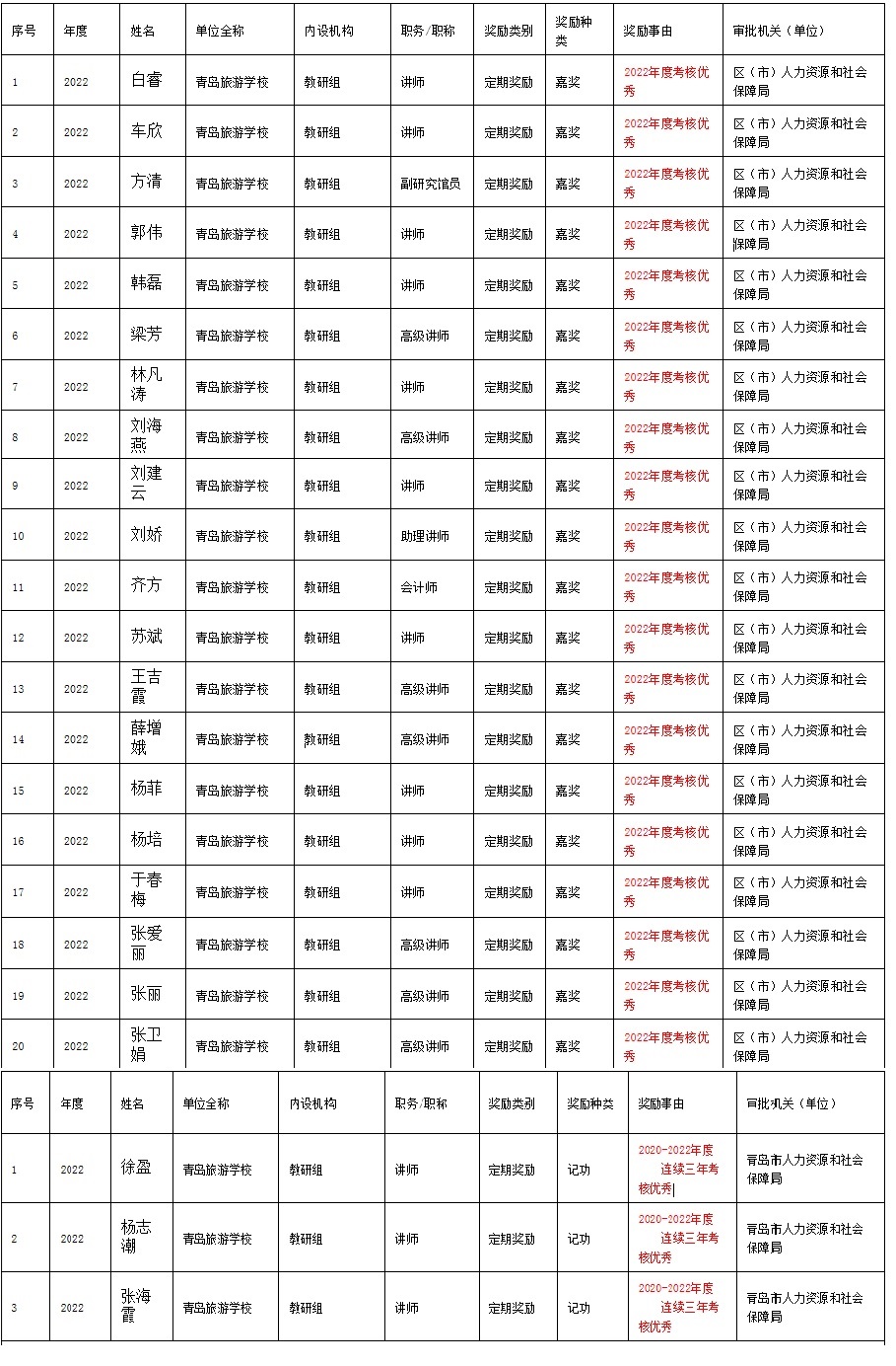 青島旅游學(xué)校2022年事業(yè)單位工作人員獎勵統(tǒng)計