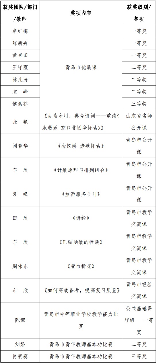 2023年學(xué)校有7名教師在青島市優(yōu)質(zhì)課比賽中分獲一、 二、三等獎(jiǎng),8名教師分別開設(shè)省市級(jí)公開課、交流課。三是實(shí)施“青藍(lán)工程”“揚(yáng)帆工程”,舉行第三年青年教師教學(xué)展示課,完成本學(xué)年師徒指導(dǎo)工作。2名青年教師在2022年市青年教師基本功比賽中 分獲二、三等獎(jiǎng),1名教師在2022年市教學(xué)能力大賽中獲一等獎(jiǎng), 1 名 教師青島市教育局中小學(xué)教師讀書先進(jìn)個(gè)人。