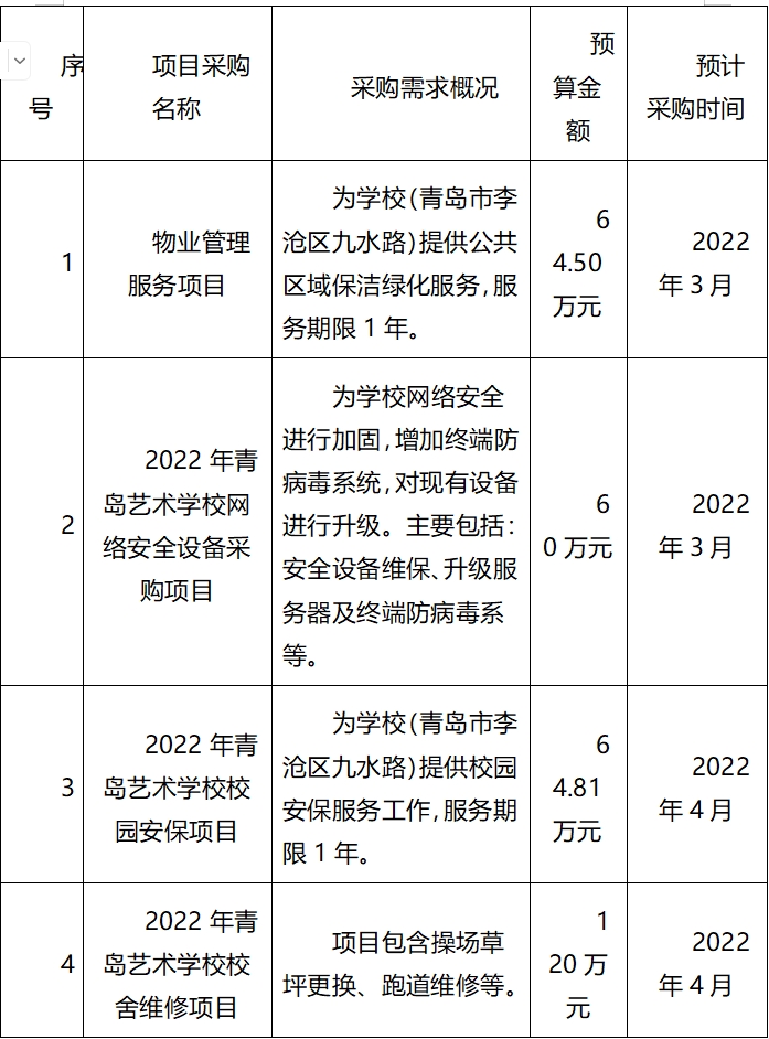 為便于供應商及時了解政府采購信息,根據(jù)《財政部關于開展政府采購意向公開工作的通知》(財庫〔2020〕10號)等有關規(guī)定,現(xiàn)將青島藝術學校2022年3-4月采購意向公開如下: