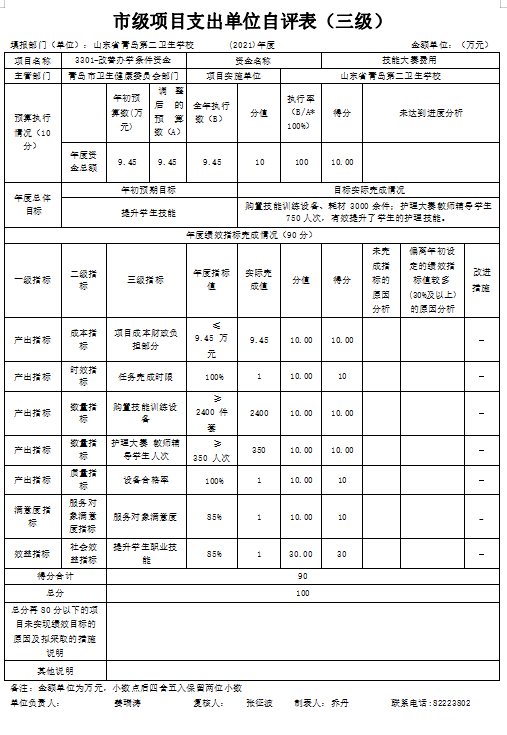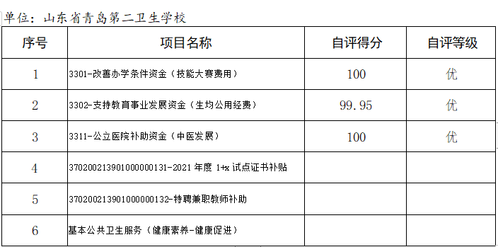 山東省青島第二衛(wèi)生學(xué)校2021年度市級(jí)預(yù)算安排項(xiàng)目支出績 效自評(píng)的3個(gè)項(xiàng)目中,3個(gè)項(xiàng)目自評(píng)等級(jí)為優(yōu),0個(gè)項(xiàng)目自評(píng)等級(jí)為 良,0個(gè)項(xiàng)目自評(píng)等級(jí)為中,0個(gè)項(xiàng)目自評(píng)等級(jí)為差。從自評(píng)情況 看,項(xiàng)目支出績效管理的重視程度進(jìn)一步提升,大部分項(xiàng)目有序 開展,執(zhí)行和完成情況較好,資金使用比較規(guī)范,各項(xiàng)目的實(shí)施取得了較好的社會(huì)效益,但也存在部分項(xiàng)目產(chǎn)出指標(biāo)低于預(yù)期、項(xiàng)目實(shí)施進(jìn)展慢等問題。