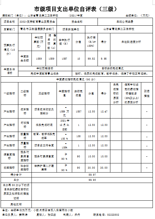 2.生均公用經(jīng)費(fèi)項(xiàng)目績效自評(píng)綜述:根據(jù)年初設(shè)定的績效目 標(biāo),項(xiàng)目自評(píng)得分為99.95分。全年預(yù)算數(shù)為1089.00萬元,執(zhí)行 數(shù)為1087.00萬元,完成預(yù)算的99.83%。項(xiàng)目績效目標(biāo)完成情況: 一是按時(shí)、保量、保質(zhì)完成教育、教學(xué)任務(wù);二是取得了較好的 社會(huì)效益,為社會(huì)培養(yǎng)合格護(hù)理人才,護(hù)士證通過率高于90%;三是學(xué)生及社會(huì)等服務(wù)對(duì)象滿意度較高。