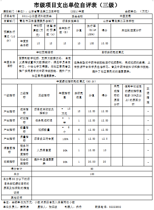 3.中醫(yī)發(fā)展項(xiàng)目績效自評(píng)綜述:根據(jù)年初設(shè)定的績效目標(biāo),項(xiàng)目自評(píng)得分為100分。全年預(yù)算數(shù)為15.00萬元,執(zhí)行數(shù)為15.00 萬元,完成預(yù)算的100.00%。項(xiàng)目績效目標(biāo)完成情況: 一是錄制教 學(xué)等視頻6個(gè);二是項(xiàng)目實(shí)施按計(jì)劃進(jìn)行,且資金使用規(guī)范;三是服務(wù)對(duì)象的滿意度高于90%,提升中醫(yī)健康素養(yǎng)。