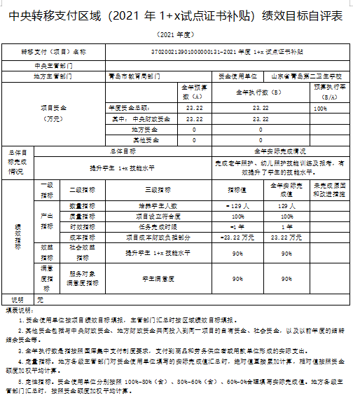 4.2021年度試點(diǎn)證書補(bǔ)貼項(xiàng)目績效自評(píng)綜述:根據(jù)年初設(shè)定 的績效目標(biāo),項(xiàng)目自評(píng)得分為100分。全年預(yù)算數(shù)為23.22萬元, 執(zhí)行數(shù)為23.22萬元,完成預(yù)算的100%。項(xiàng)目績效目標(biāo)完成情況: 一是提升學(xué)生幼兒照護(hù)、老年照護(hù)技能水平;二是取得了較好的 社會(huì)效益,為社會(huì)培養(yǎng)合格幼兒照護(hù)、老年照護(hù)等人才;三是服務(wù)對(duì)象滿意度較高。