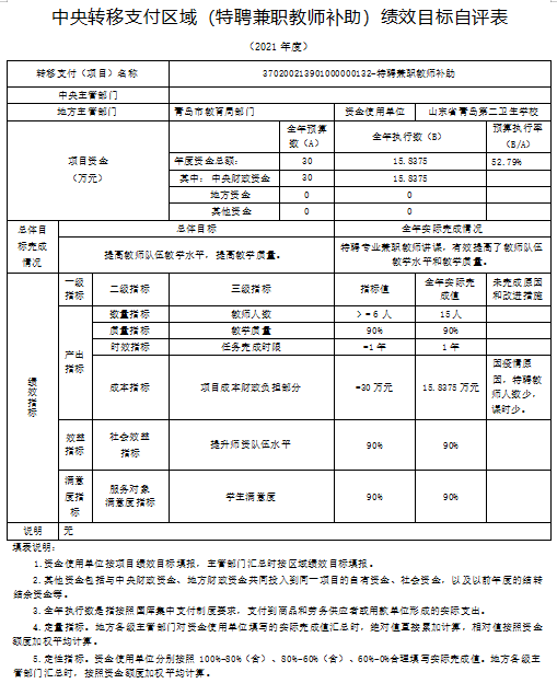 5.特聘兼職教師補(bǔ)助項(xiàng)目績效自評(píng)綜述:根據(jù)年初設(shè)定的績 效目標(biāo),項(xiàng)目自評(píng)得分為95.28分。全年預(yù)算數(shù)為30.00萬元,執(zhí) 行數(shù)為15.83萬元,完成預(yù)算的52.79%。項(xiàng)目績效目標(biāo)完成情況: 一是有效提升了師資隊(duì)伍水平和教學(xué)質(zhì)量;二是項(xiàng)目實(shí)施按計(jì)劃進(jìn)行,且資金使用規(guī)范;三是服務(wù)對(duì)象的滿意度高于90%,有效提升了學(xué)生的助產(chǎn)技能。發(fā)現(xiàn)的主要問題及原因:因疫情原因,特 聘教師人數(shù)少,課時(shí)少,故資金執(zhí)行率未達(dá)100%。下一步改進(jìn)措 施:進(jìn)一步規(guī)范資金管理,合理制定績效成本指標(biāo)以確保資金使用準(zhǔn)確性和有效性。