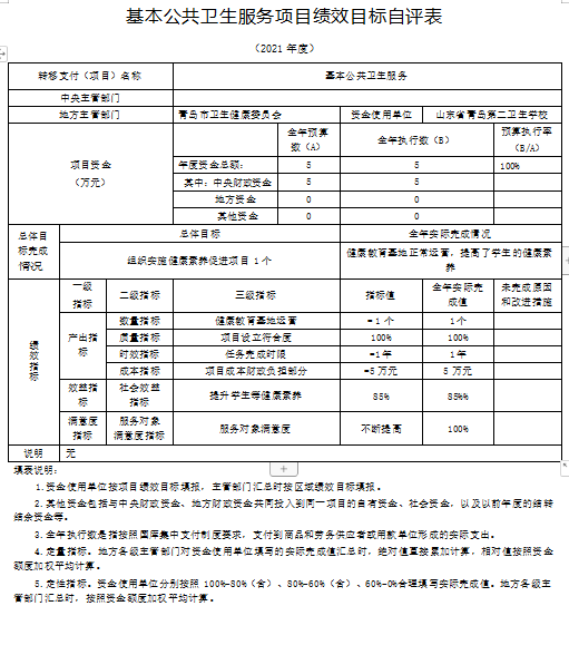 根據(jù)預(yù)算績效管理要求,山東省青島第二衛(wèi)生學(xué)校按照“誰 用款、誰評(píng)價(jià)”的原則,組織對(duì)2021年度市級(jí)預(yù)算項(xiàng)目支出進(jìn)行 全面自評(píng),涵蓋項(xiàng)目6個(gè);涉及預(yù)算資金1155.50萬元,占單位預(yù)算項(xiàng)目支出總額的100.00%。