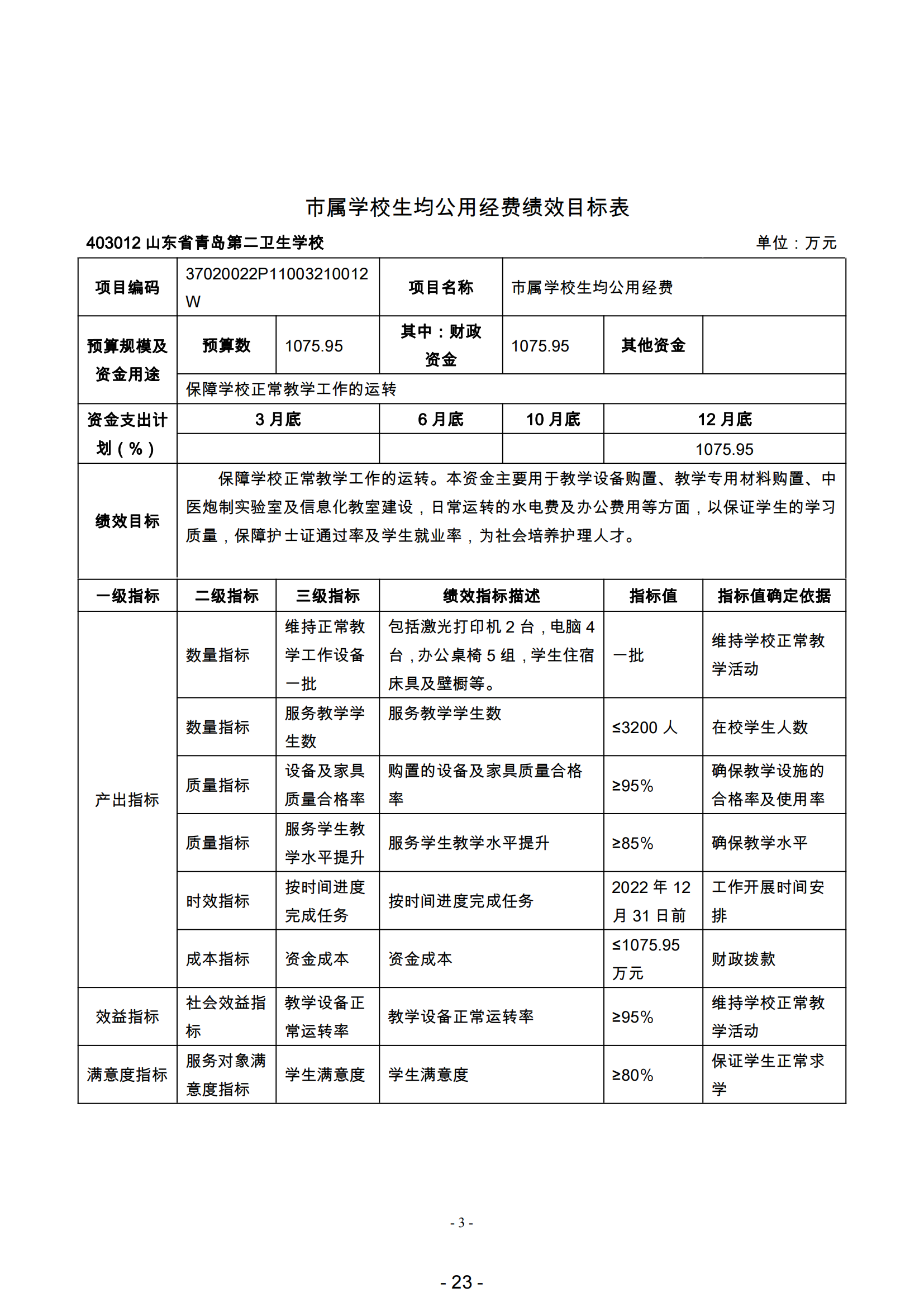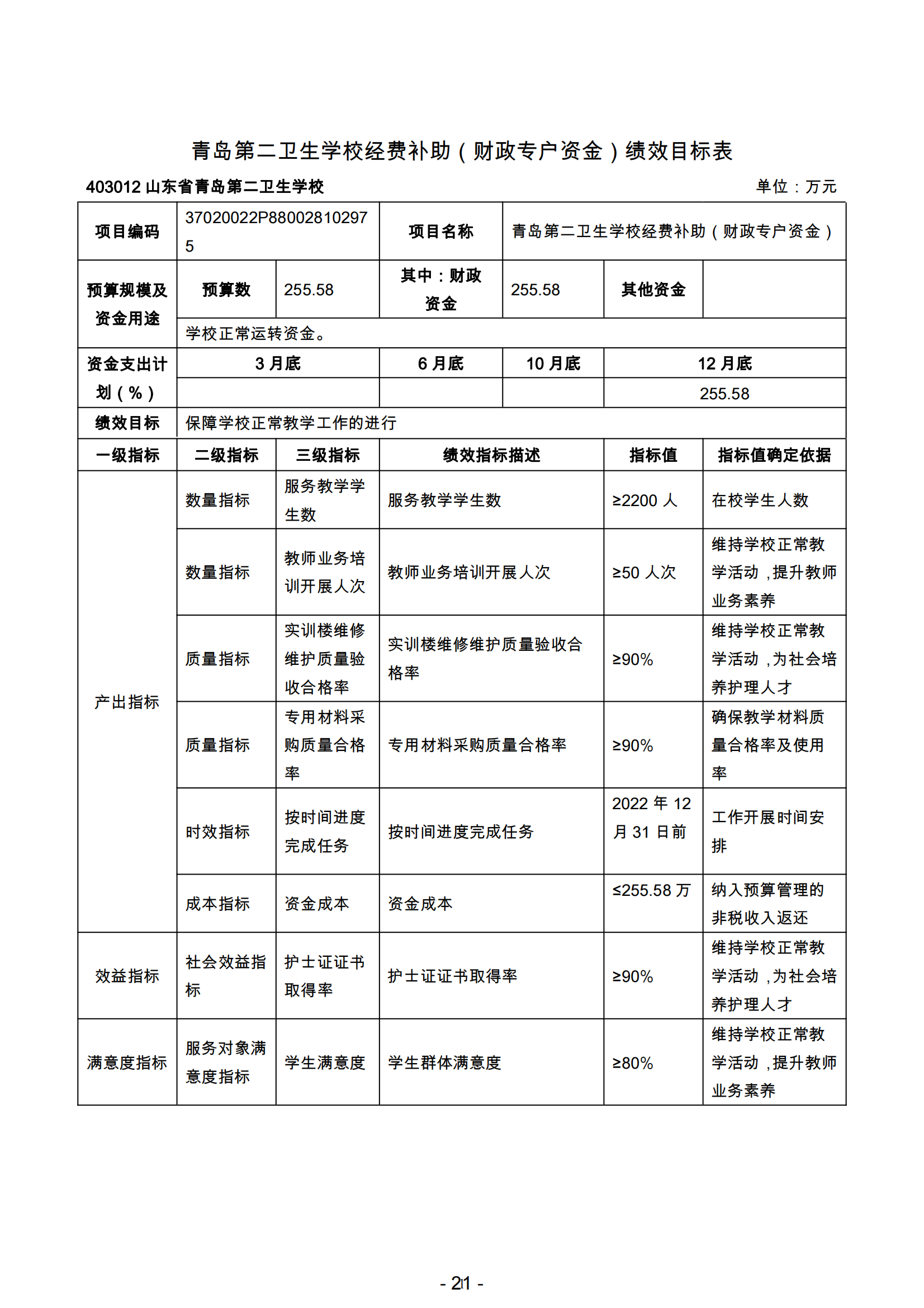 山東省青島第二衛(wèi)生學(xué)校2022年項(xiàng)目支出全面實(shí)施績(jī)效目標(biāo) 管理,涉及預(yù)算項(xiàng)目支出3個(gè),預(yù)算資金1336.53萬元,其中財(cái)政 撥款1080.95萬元。擬對(duì)基本公共衛(wèi)生服務(wù)補(bǔ)助資金項(xiàng)目開展單位重點(diǎn)績(jī)效評(píng)價(jià),涉及預(yù)算資金5.00 萬元,其中財(cái)政撥款5.00萬元。根據(jù)以前年度績(jī)效評(píng)價(jià)結(jié)果,優(yōu)化學(xué)校經(jīng)費(fèi)補(bǔ)助(財(cái)政專戶 資金)、基本公共衛(wèi)生服務(wù)補(bǔ)助資金、市屬學(xué)校生均公用經(jīng)費(fèi)等項(xiàng)目支出2022年預(yù)算安排,進(jìn)一步改進(jìn)管理、完善政策。