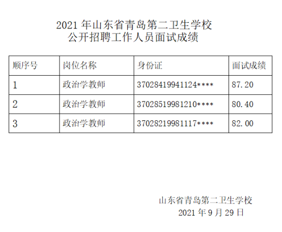 2021年山東省青島第二衛(wèi)生學校公開招聘工作人員面試成績