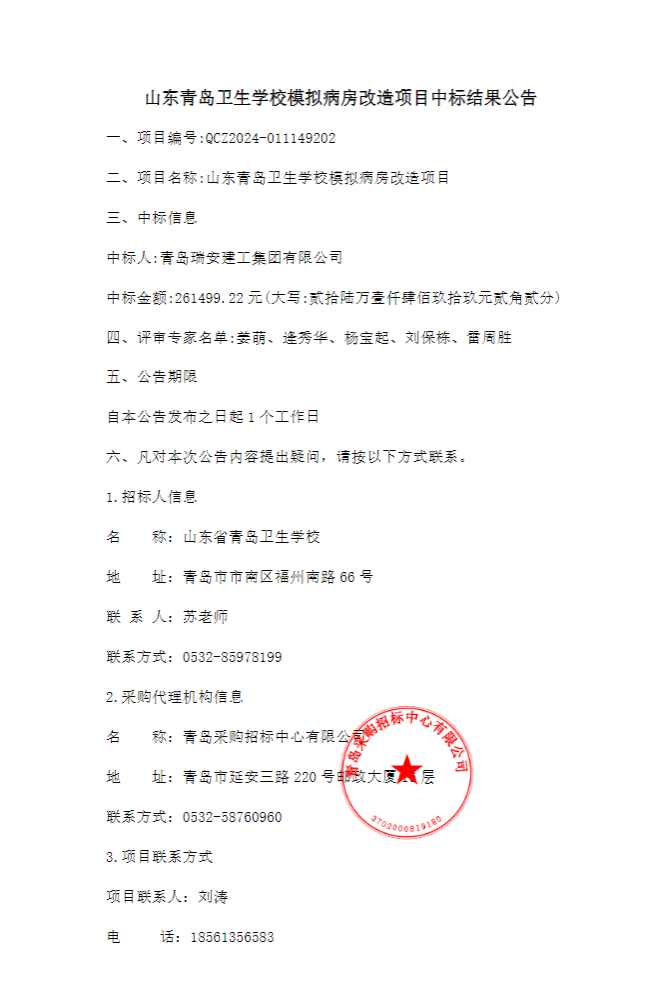 山東省青島衛(wèi)生學(xué)校模擬病房改造項(xiàng)目中標(biāo)結(jié)果公示