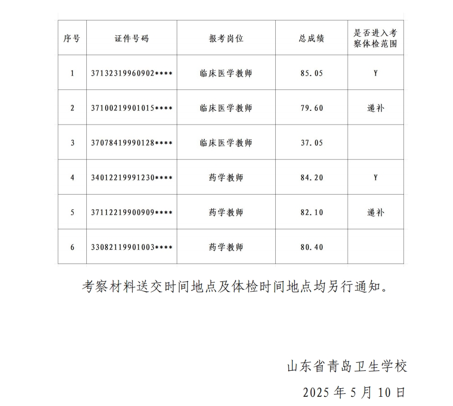 山東省青島衛(wèi)生學(xué)校2025年公開招聘衛(wèi)生類崗位考生總成績及進入考察體檢范圍人員名單