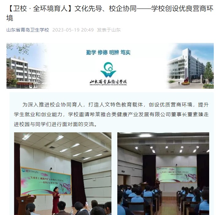 深入推進校企協(xié)同育人,打造人文特色教育載體,創(chuàng)設(shè)優(yōu)質(zhì)營商環(huán)境,提升學(xué)生就業(yè)和創(chuàng)業(yè)能力,學(xué)校邀請希萊雅合美健康產(chǎn)業(yè)發(fā)展有限公司董事長董素臻走進校園與同學(xué)們進行面對面的交流。