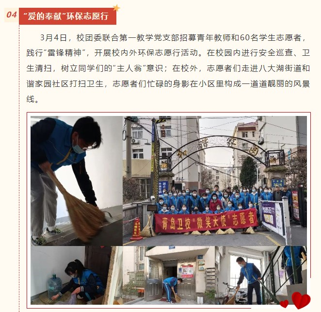 3月4日,校團委聯(lián)合第一教學(xué)黨支部招募60名學(xué)生志愿者,開展踐行“雷鋒精神”,淬煉學(xué)生熱愛勞動的優(yōu)良品質(zhì)的校內(nèi)外環(huán)保志愿行活動。在校園內(nèi)進行安全巡查、衛(wèi)生清掃,樹立同學(xué)們的“主人翁”意識和動手勞動能力;在校外,志愿者們走進八大湖街道和諧家園社區(qū)打掃衛(wèi)生,志愿者們忙碌的身影在小區(qū)里構(gòu)成一道道靚麗的風(fēng)景線。