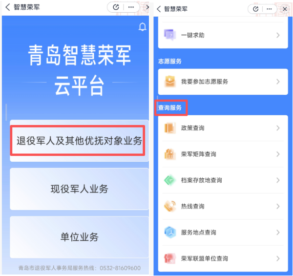 政策查詢、榮軍矩陣查詢、檔案存放地查詢、退役軍人服務(wù)站查詢、榮軍聯(lián)盟單位查詢等更多查詢信息,可登錄“愛山東”APP,搜索“智慧榮軍”平臺,依次點擊【退役軍人及其他優(yōu)撫對象業(yè)務(wù)】→【查詢服務(wù)】進行在線查詢。