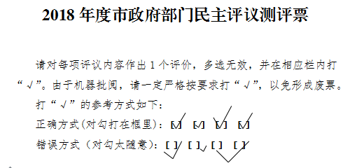 為調(diào)查了解市民代表對市政府部門履行職責(zé)的滿意度,請您結(jié)合市政府部門現(xiàn)場述職及平時了解掌握的情況,認(rèn)真填寫《2018年度市政府部門民主評議測評票》。測評結(jié)果納入2018年市政府部門綜合考核成績。