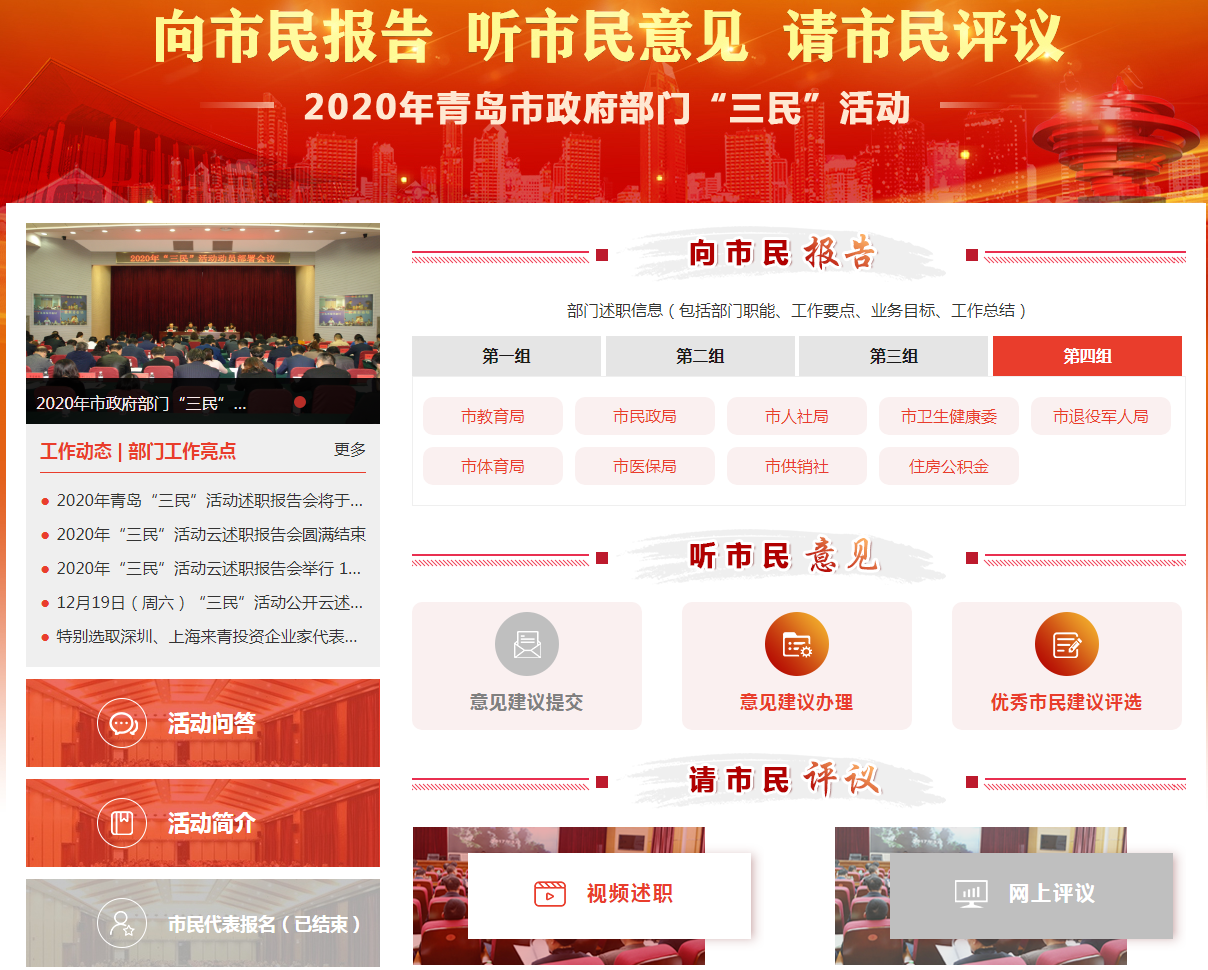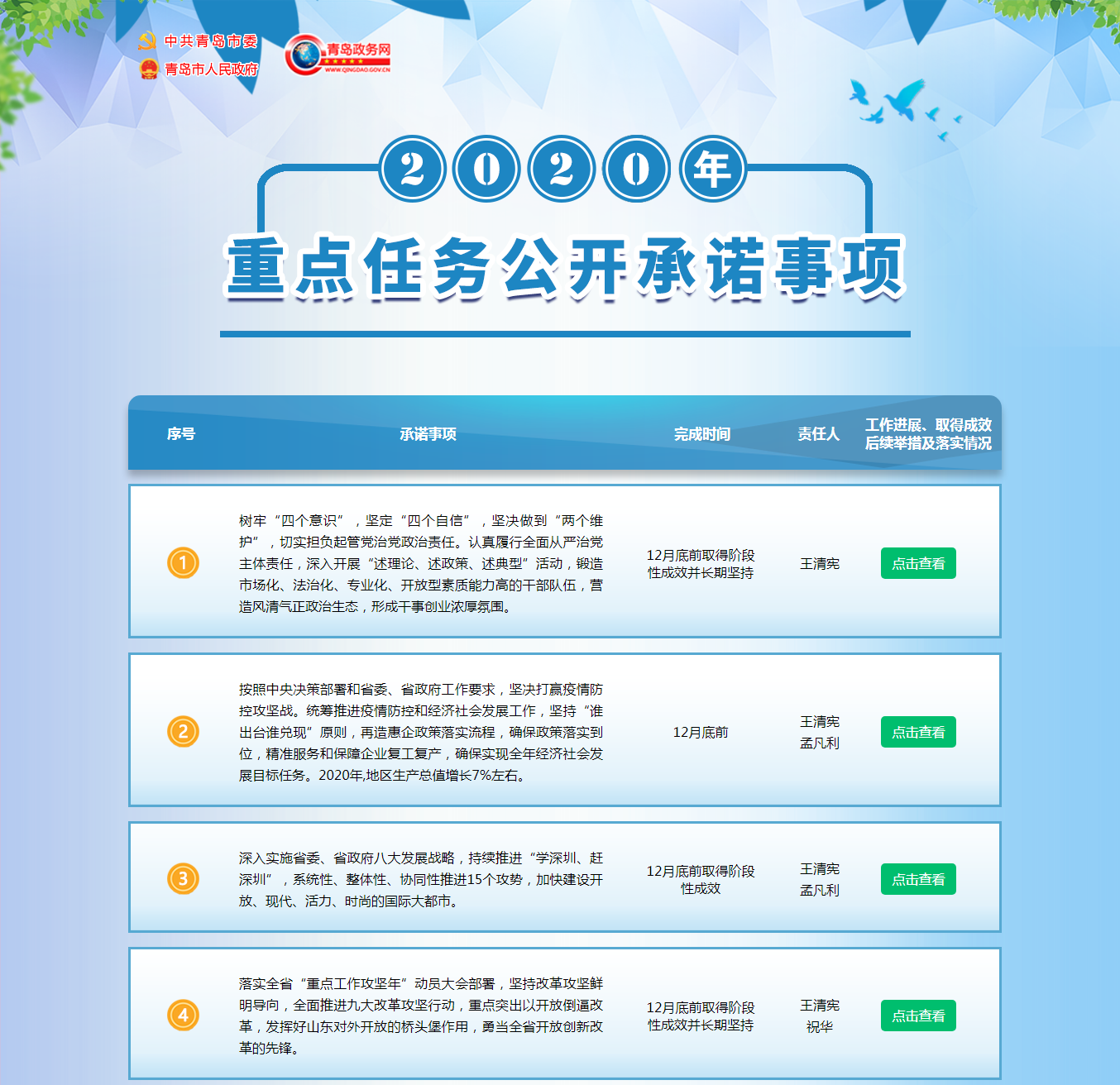 二是突出重點,把握工作導(dǎo)向。今年以來,青島市以決策、執(zhí)行、管理、服務(wù)和結(jié)果五公開為抓手,以重點領(lǐng)域信息公開為核心,以平臺建設(shè)為支撐,以機制保障為基礎(chǔ),高質(zhì)量全方位推進政務(wù)公開工作。印發(fā)《2020年青島市政務(wù)公開工作要點》(青政辦字〔2020〕58號),從四個方面明確52項重點工作任務(wù),壓實責(zé)任單位,督促各單位主動靠前、積極作為、密切配合、協(xié)調(diào)推進,形成工作合力。加大決策公開力度。持續(xù)推進重大決策預(yù)公開,發(fā)布《青島市政府2020年度重大行政決策事項目錄》并及時進行調(diào)整,6項重大決策事項逐一列明承辦部門、決策時間及公眾參與方式,并對決策依據(jù)、決策草案、公開征求意見及建議采納情況等及時向社會公開。市政府各部門開門決策,通過青島政務(wù)網(wǎng)征集調(diào)查欄目發(fā)布意見征集信息33條,廣泛聽取群眾意見和建議,并將意見采納情況予以反饋。創(chuàng)新會議決策解讀形式,通過圖文、視頻等形式,對市政府常務(wù)會議常態(tài)化進行解讀。全面梳理今年以來各級各部門制發(fā)主動公開的公文,要求制發(fā)1個工作日內(nèi)必須在有關(guān)政府門戶網(wǎng)站、政務(wù)新媒體上及時發(fā)布。深入推進執(zhí)行公開。在青島政務(wù)網(wǎng)開通“2020年重點任務(wù)公開承諾事項”專欄,及時公開各承諾事項的工作進展、成效、措施等。