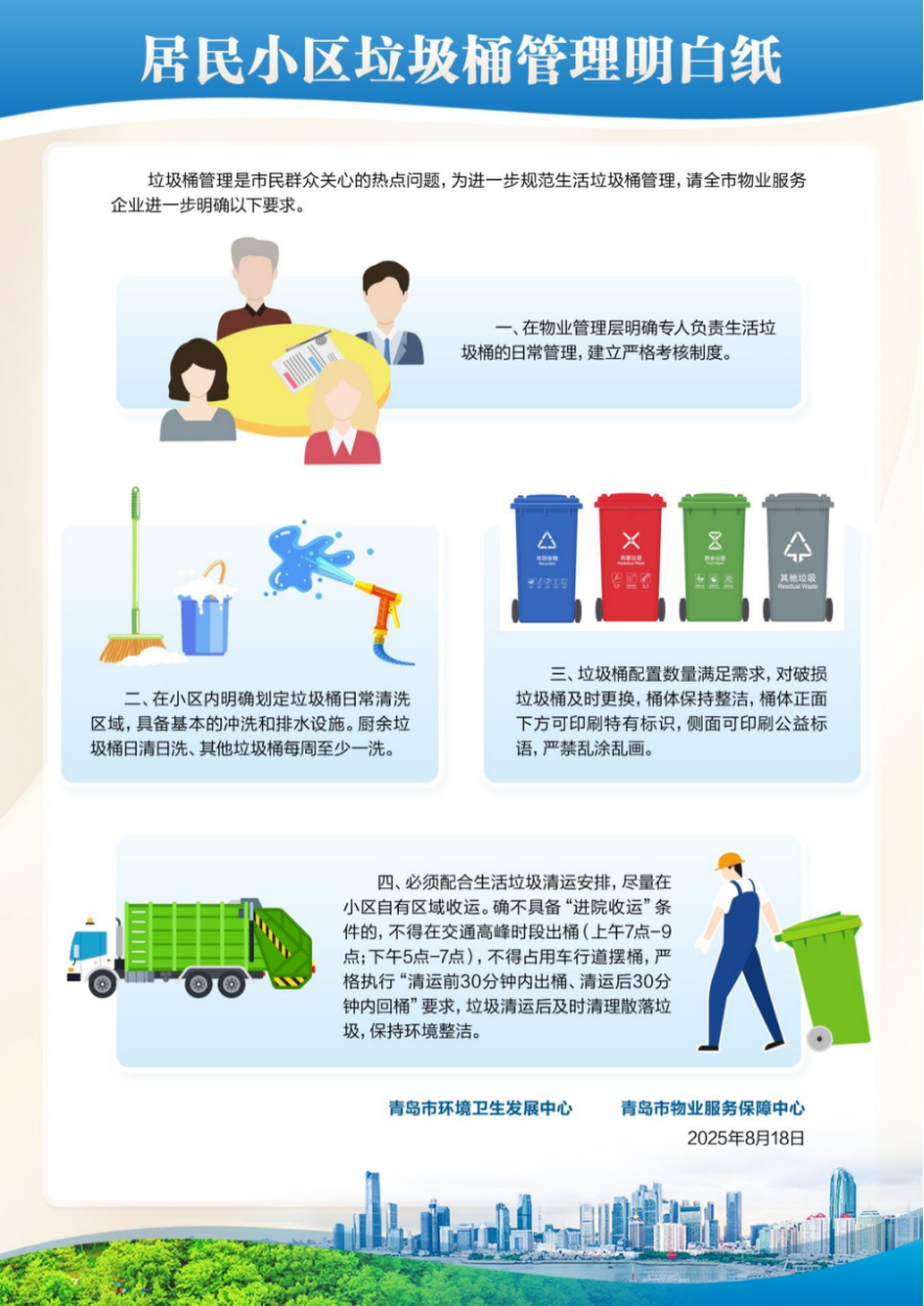 為進(jìn)一步規(guī)范生活垃圾桶管理,滿足市民群眾精細(xì)化、高品質(zhì)環(huán)境衛(wèi)生需求,市城市管理局聚焦居民小區(qū)垃圾桶臟亂、破損、占道及收運(yùn)點(diǎn)污染等問(wèn)題,向物業(yè)服務(wù)企業(yè)及其他相關(guān)單位發(fā)放《居民小區(qū)垃圾桶管理明白紙》。通過(guò)明確管理制度、垃圾桶清洗、垃圾桶配置、垃圾桶標(biāo)識(shí)、垃圾桶出回桶等方面要求和標(biāo)準(zhǔn),推動(dòng)企業(yè)建立完善長(zhǎng)效機(jī)制,壓實(shí)管理責(zé)任,精確掌握作業(yè)標(biāo)準(zhǔn),切實(shí)提升管理效能和精細(xì)化管理水平。