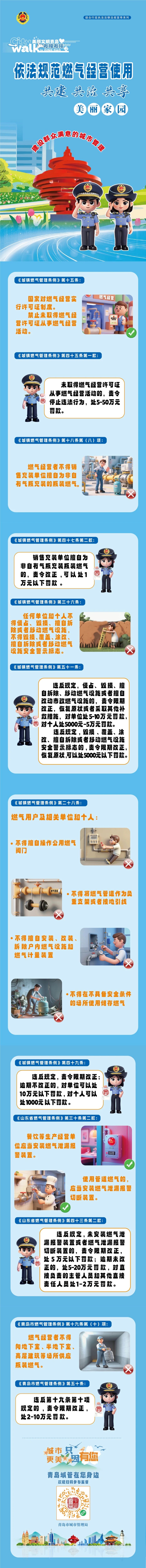 燃氣安全無小事,執(zhí)法護航千萬家!違法經(jīng)營、儲存、使用燃氣,可能埋下巨大的安全隱患,甚至引發(fā)燃氣閃爆、火災(zāi)等安全事故,涉事人員還需承擔相應(yīng)的法律責任。市城市管理局溫馨提醒:請各燃氣經(jīng)營者和燃氣用戶嚴格遵守燃氣管理相關(guān)法律法規(guī),依法經(jīng)營燃氣,規(guī)范使用燃氣,堅決守牢安全底線。讓我們攜手同行,共建安全用氣環(huán)境,共同守護萬家幸福!