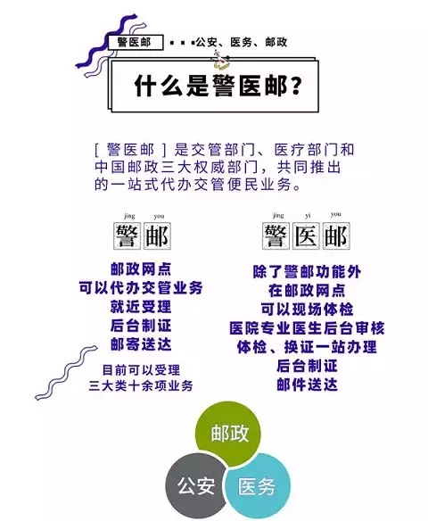 “警醫(yī)郵”服務(wù)點(diǎn)是本市公安交警部門會(huì)同醫(yī)療、郵政等部門聯(lián)合打造的便民服務(wù)網(wǎng)點(diǎn),把公安車駕管服務(wù)延伸到駕駛?cè)梭w檢醫(yī)院,使市民群眾在醫(yī)院即可自主辦理駕駛證申領(lǐng)、補(bǔ)換領(lǐng)等業(yè)務(wù),享受體檢、拍照、信息采集、業(yè)務(wù)辦理等“一站式”服務(wù)。