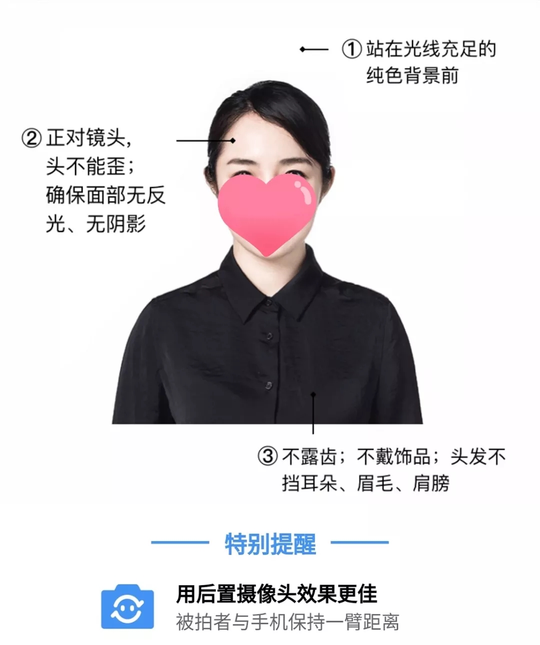 辦理期滿換證業(yè)務(wù)的用戶,可以根據(jù)下圖提示提前在家自助完成駕駛證照片拍攝存手機(jī)內(nèi),或帶上白底一寸電子照至網(wǎng)點(diǎn)辦理,避免在網(wǎng)點(diǎn)脫口罩拍照增加被感染的風(fēng)險(xiǎn)。