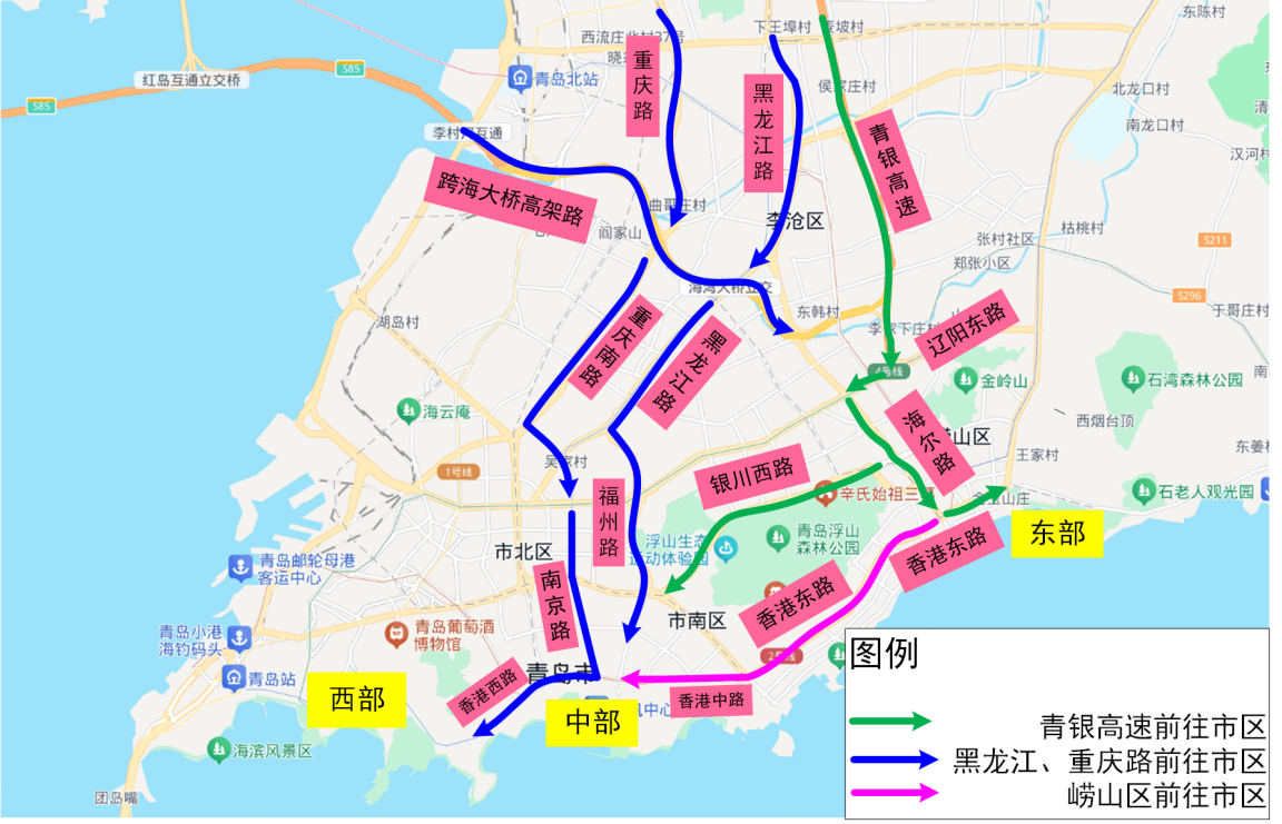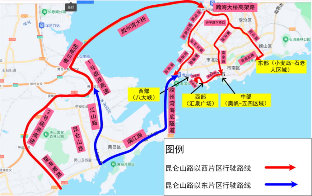 2.昆侖山路以東:可經(jīng)江山路→1號疏港高速→青蘭高速/膠州灣大橋→環(huán)灣路/跨海大橋高架路前往市區(qū),或沿膠州灣海底隧道→貴州路駛?cè)胛鞑?/span>片區(qū)。