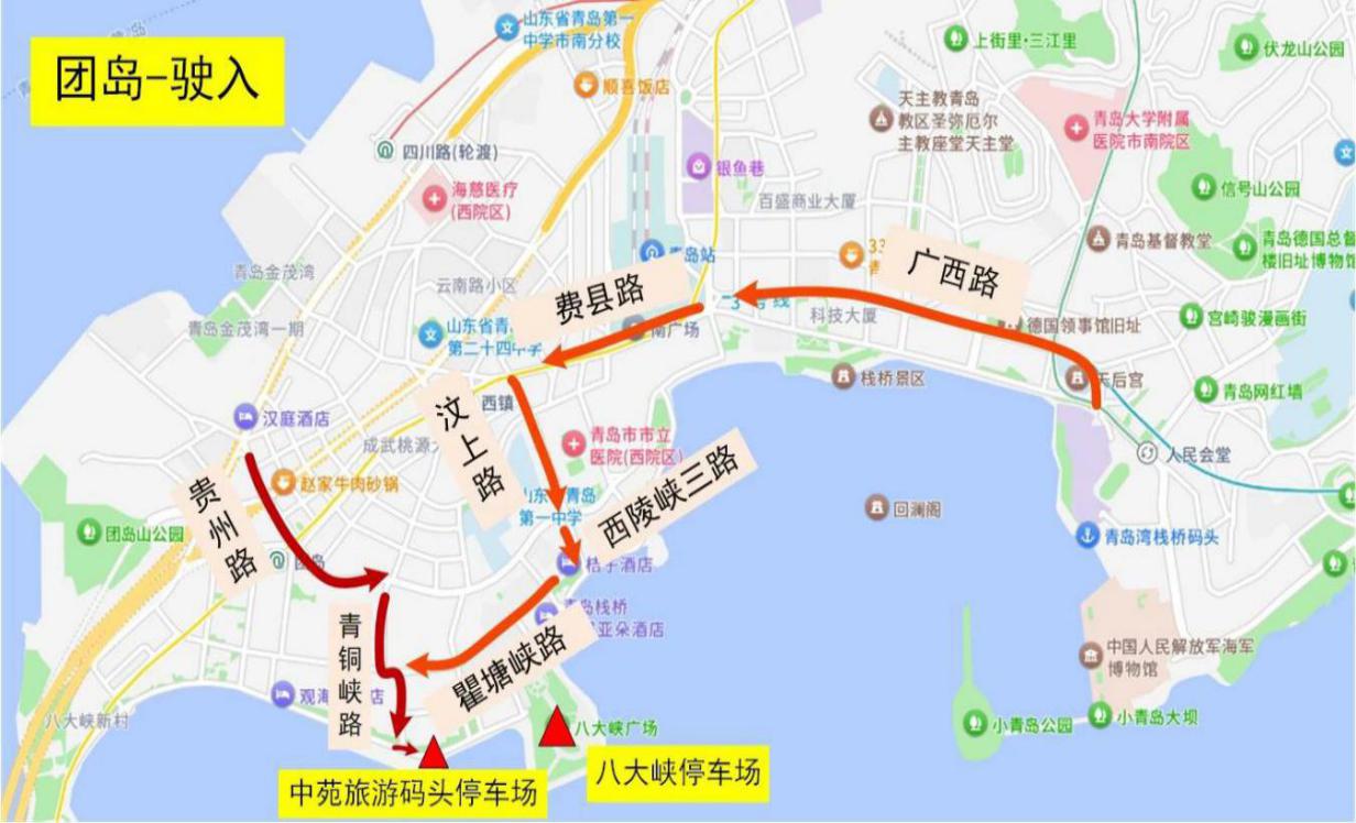 駛?cè)耄?/span>香港中路→香港西路→文登路→武昌路→停車場