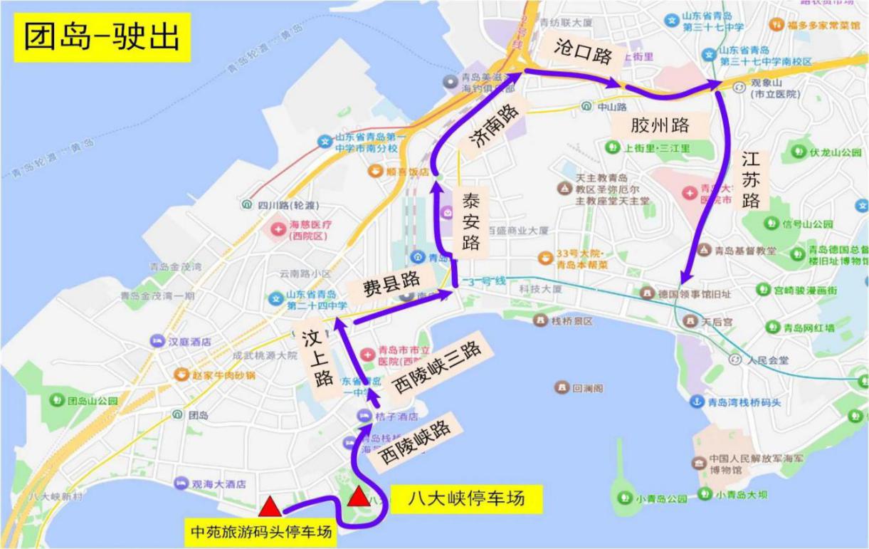 駛出1:停車場→常州路→廣西路→泰安路→費縣路→團島方向