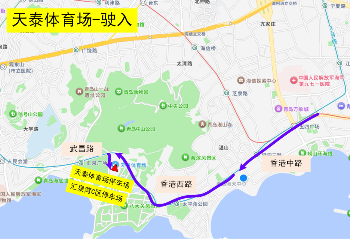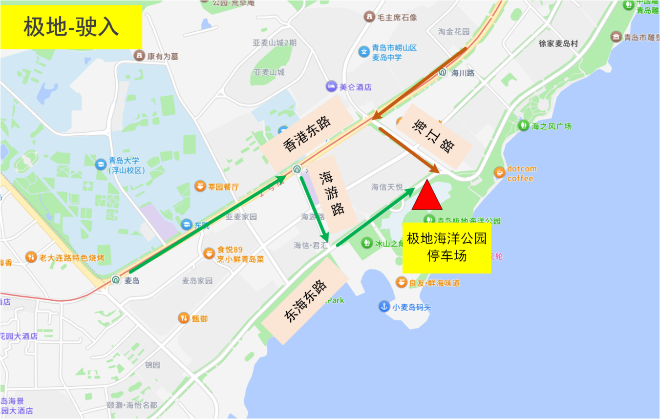 駛?cè)?/span>1:香港東路西段→海游路→東海東路→停車場