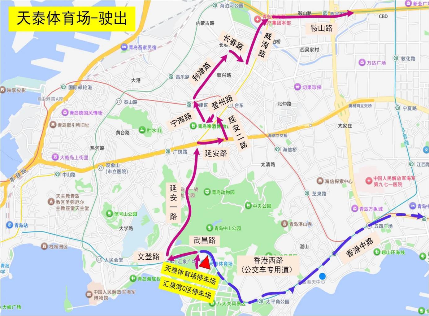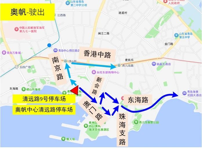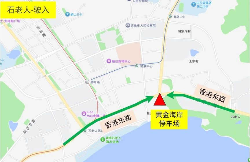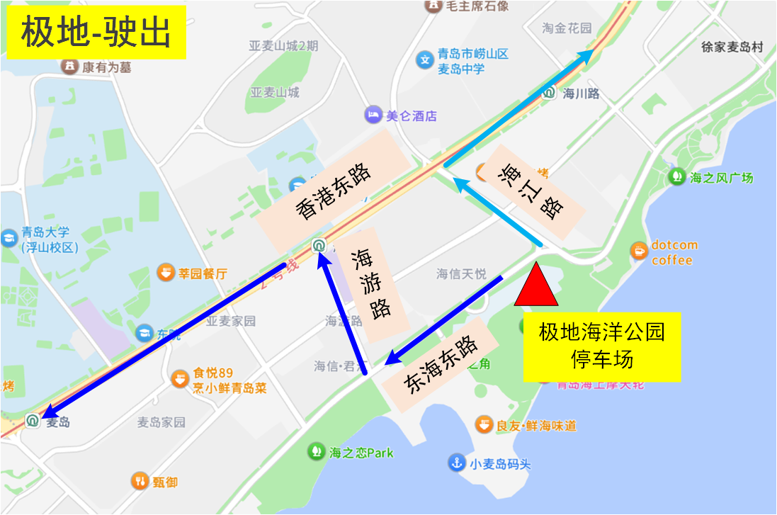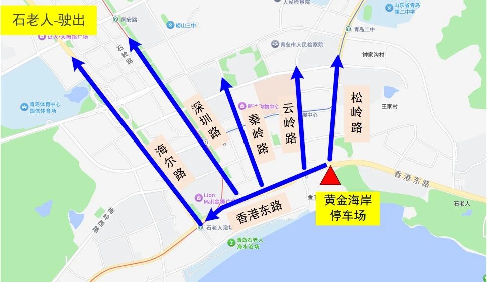 駛出:黃金海岸停車場→香港東路→海爾路/深圳路/松嶺路/秦嶺路/云嶺路