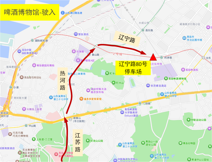 駛?cè)耄?/span>江蘇路→熱河路→遼寧路→遼寧路80號停車場
