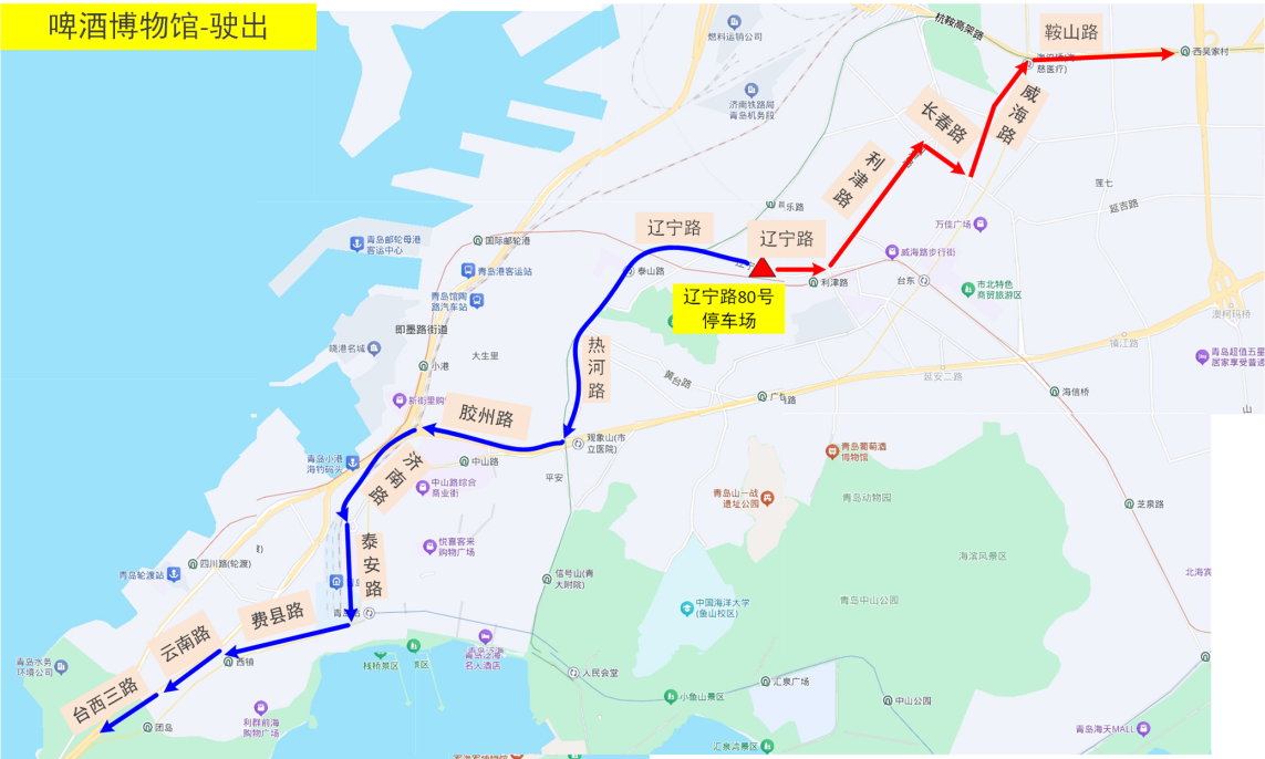 駛出2:遼寧路80號停車場→遼寧路→熱河路→膠州路→濟南路→泰安路→費縣路→西藏路→云南路→臺西三路