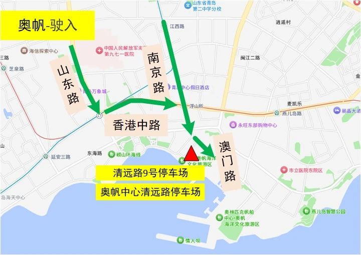 駛?cè)?/span>2:山東路→香港中路→澳門路→停車場