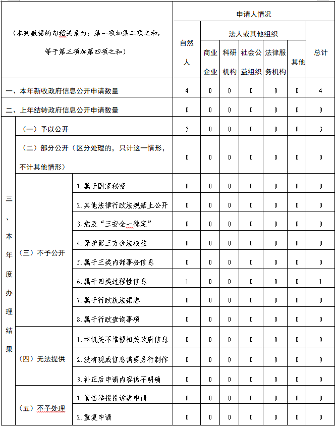 落實全省“依申請公開質(zhì)效提升年”活動要求,強化細(xì)化各環(huán)節(jié)工作要求,依法依規(guī)及時準(zhǔn)確予以答復(fù)反饋。本年度收到政府信息公開申請4件,均為自然人申請,從申請內(nèi)容上看,主要涉及行政執(zhí)法過程信息、住房補貼提取相關(guān)辦法、單位機構(gòu)設(shè)置情況、單位領(lǐng)導(dǎo)分工情況等,已按規(guī)定時限答復(fù)申請人,其中予以公開3件、不予公開1件。本年度未收到因信息公開引起的行政復(fù)議和行政訴訟。