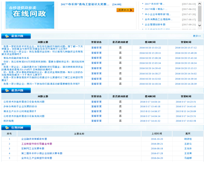 (三) 加強與市民互動和溝通交流。通過青島市中小企業(yè)公共服務平臺,積極開通微信、微博等客戶端,及時公布支持工業(yè)和信息產(chǎn)業(yè)發(fā)展、中小微企業(yè)發(fā)展、“雙創(chuàng)”、改造提升傳統(tǒng)動能、優(yōu)化產(chǎn)業(yè)結(jié)構(gòu)等方面的政策措施,擴大傳播范圍,提高知曉度。委領(lǐng)導定期通過《在線問政》、《行風在線》、《民生在線》等欄目加強與公眾的互動交流,全年參與在線交流活動8次。