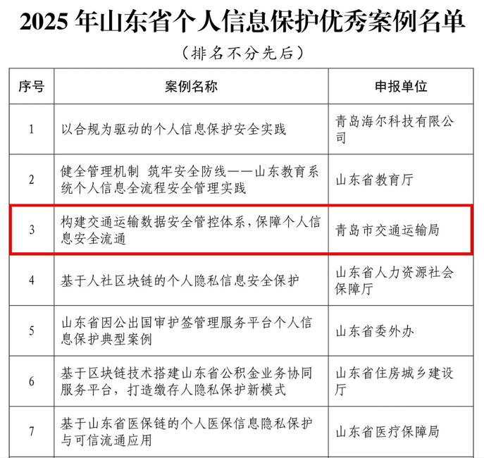 青島交通運(yùn)輸數(shù)據(jù)安全管控體系獲評2025年山東省個(gè)人信息保護(hù)優(yōu)秀案例